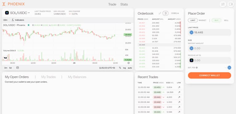 Phoenix é uma corretora descentralizada de Order book, suportando mercados para spot trading. Ou seja, os usuários indicam os preços em que querem comprar/vender ativos e criam uma ordem que será executada caso outro usuário crie uma ordem de venda/compra no sentido oposto com os mesmos valores.