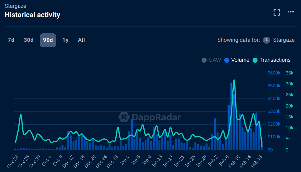A Stargaze oferece retornos reais aos detentores do token nativo STARS. Além de suportar funcionalidades básicas de criação e negociação de NFTs, como mint e troca, também possui ferramentas avançadas de negociação. A rede é protegida por um conjunto de validadores e oferece recompensas de rendimento real aos detentores de STARS por atividades no protocolo, como mintagem, negociação e segurança da rede. Uma característica única é a aplicação de royalties na rede, garantindo que os criadores e desenvolvedores recebam suas devidas comissões. Além disso, por atualmente as transações terem custo zero, a Stargaze oferece mintagem e negociação de NFTs sem taxas de gás e permite que os desenvolvedores também ganhem royalties através de contratos inteligentes escritos em Rust. Por ser o maior mercado de NFTs do ecossistema e por dividir receitas com os stakehodlers, não é má ideia estar parcialmente exposto a este token no ecossistema