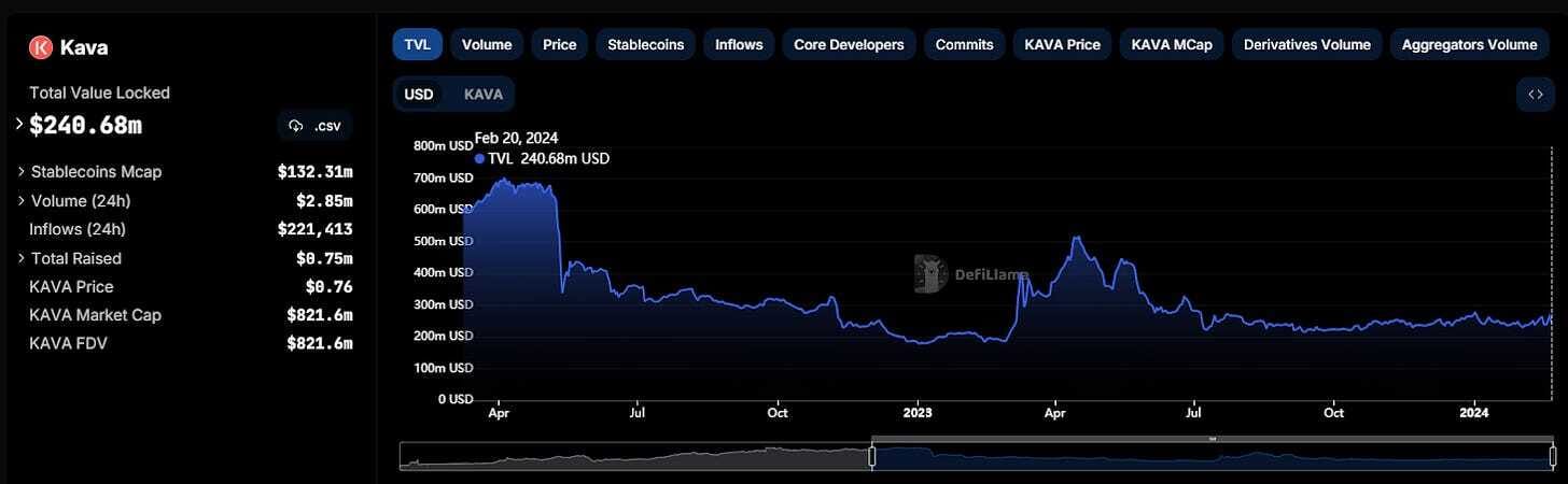 Kava Network é governada pela Kava DAO, composta por stakers e validadores da KAVA que ajudam a assegurar e operar a rede.Apesar dos mais de 125 dApp lançados na blockchain Kava, o TVL permanece parado na região dos 240 milhões desde Julho de 2023. No entanto, é de se esperar um crescimento na atividade nos próximos meses devido as narrativas de Airdrop.