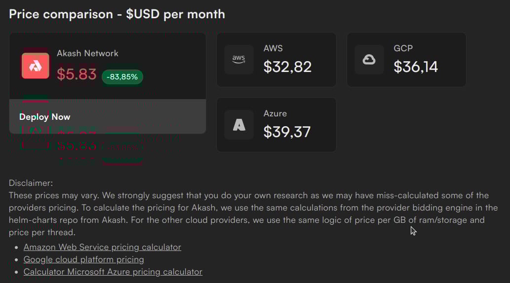 O custo de hospedagem no Akash é significativamente menor do que em outras plataformas de nuvem (Amazon, Google e Microsoft), e o fato da rede ser descentralizada permite maior controle sobre os preços e atributos dos serviços. Seus últimos esforços foram focados em aumentar a capacidade de implantação e facilitar o acesso a chips de alta performance para a rede lidar melhor com cargas de trabalho intensivas, especialmente o treinamento de modelos de IA descentralizadas.