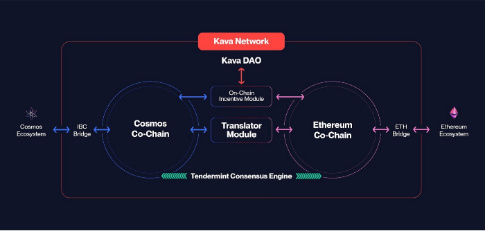 Kava tem uma arquitetura única chamada de Co-Chains o que permite a interoperabilidade entre co-chains da Ethereum e Cosmos, permitindo um ambiente mais flexível para os desenvolvedores.