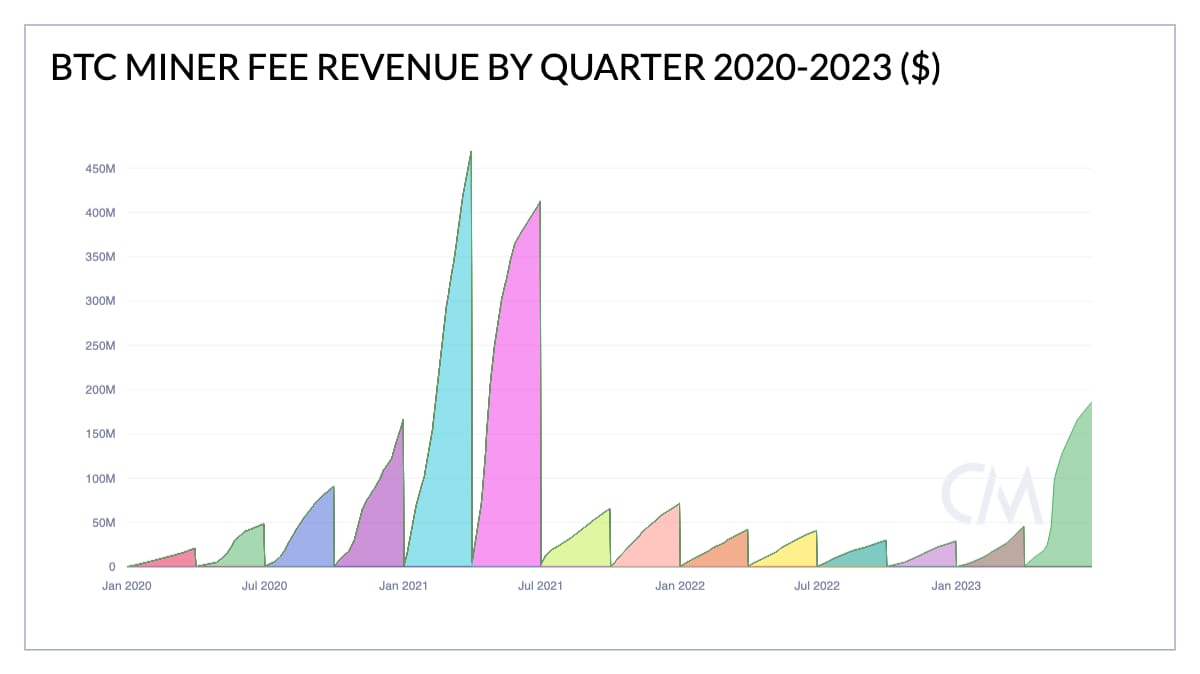 Este foi um dos trimestres mais lucrativos em quase dois anos para aqueles que recolhem taxas de transação na rede do Bitcoin. A receita de US$ 184 milhões representa um aumento de mais de 270% em relação ao primeiro trimestre de 2023.O último trimestre também foi o primeiro a ultrapassar a marca de US$ 100 milhões em receitas desde o segundo trimestre de 2021, de acordo com um relatório publicado pela Coin Metrics, uma plataforma de análise de dados de criptomoedas