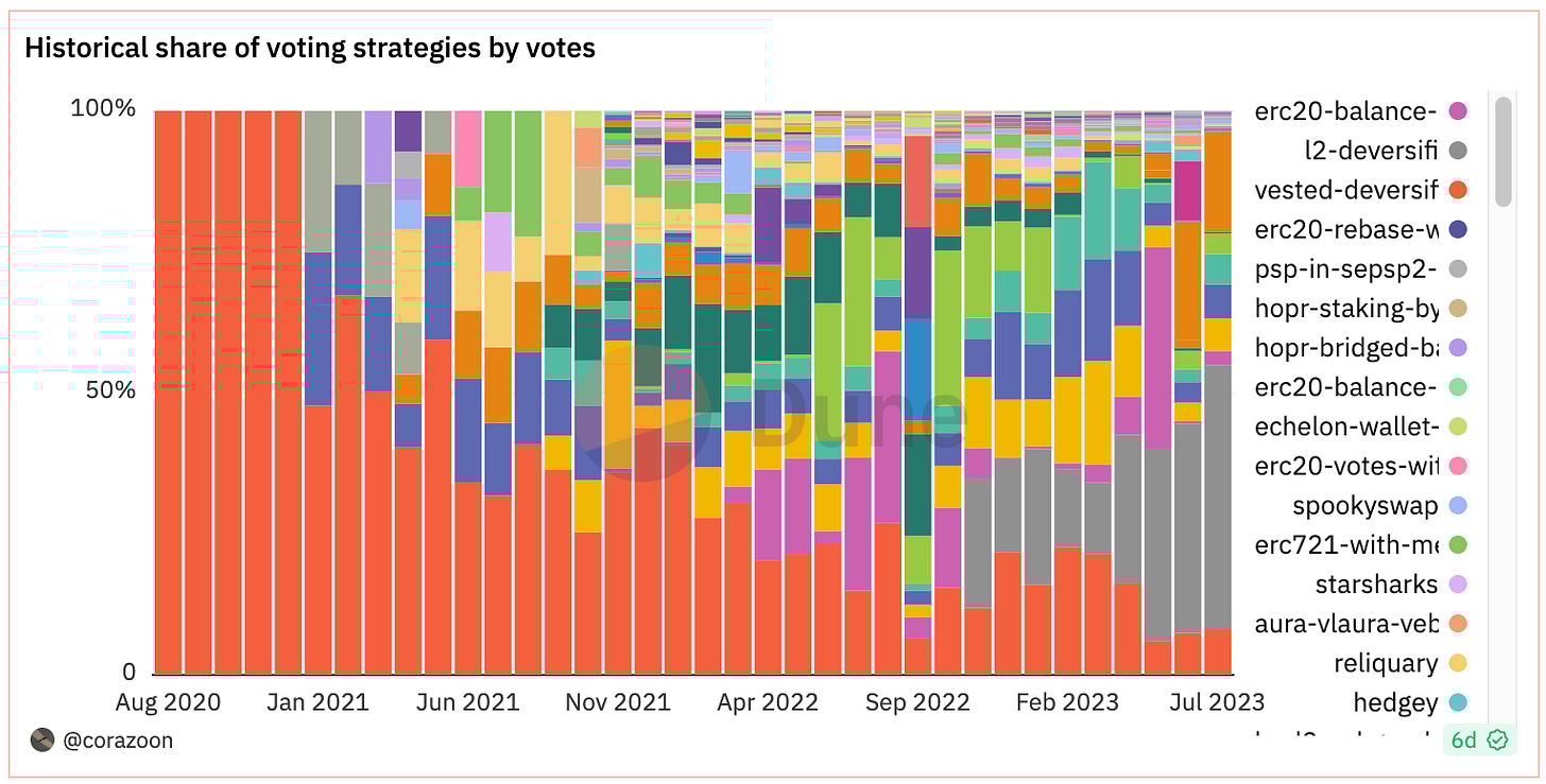 O próprio modelo de Delegados - no qual os detentores de tokens podem delegar seu poder de voto a representantes escolhidos para votar “em seu nome” - possui suas dificuldades. Apesar de ter conquistado um rápido crescimento desde o fim de 2022 e hoje capturar quase metade de todos os votos do ecossistema: