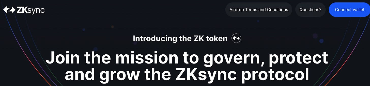 O tão aguardado airdrop do token ZK da ZKsync começou com 45% dos tokens já reivindicados nas primeiras horas (indicando uma forte pressão de venda nas primeiras horas). A "ZKsync Nation”, criada pela Matter Labs, é responsável pelo airdrop. O token abriu a US$ 0,31 e caiu para US$ 0,22, com um valor de mercado de cerca de US$ 800 milhões. As exchanges Binance, Bybit e KuCoin listaram o token, apesar de problemas técnicos iniciais na Binance. A distribuição do token inclui 89% para usuários, 16,1% para funcionários e 17,2% para investidores, com tokens bloqueados por um ano e liberados ao longo de três anos.