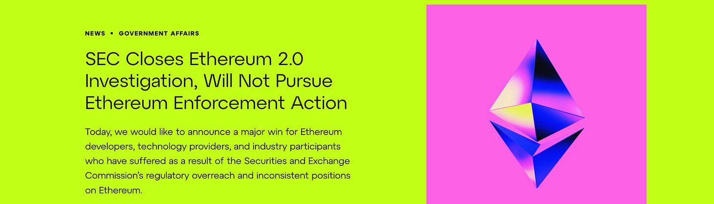 A Consensys, uma das principais desenvolvedora do Ethereum, anunciou que a Comissão de Valores Mobiliários dos EUA (SEC) está encerrando sua investigação sobre o Ethereum 2.0. A SEC notificou que não apresentará acusações alegando que as vendas de ETH são transações de valores mobiliários. Essa decisão vem após a aprovação de ETFs de Ethereum pela SEC no mês passado.
