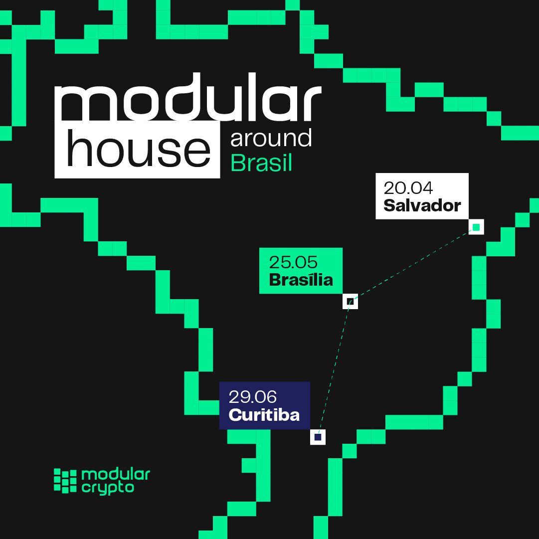 Outra grande novidade desse mês é que vamos fazer uma pequena tour pelo Brasil! Vamos passar por três cidades nos próximos meses levando o nosso evento Modular House. É a chance que vamos ter de conhecer nossos seguidores de outros estados, além de disseminar a cultura da Web3 por aí. Confira as datas:
