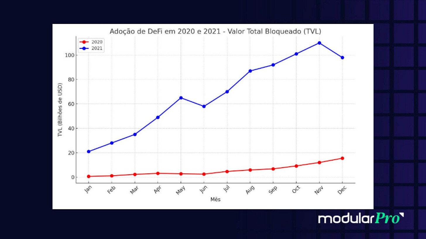Desde o DeFi Summer de 2020/2021, surgiram novos protocolos que permitem aos usuários realizar operações financeiras de forma descentralizada, como a AAVE e Compound. Essas aplicações permitem o fornecimento e empréstimo seguro de criptoativos sem qualquer intermediário (como um banco faz tradicionalmente). O crescimento desses protocolos foi enorme, com volumes de mercado que superaram dezenas de bilhões de dólares, conforme mostra o gráfico baseado em TVL (Valor total bloqueado).