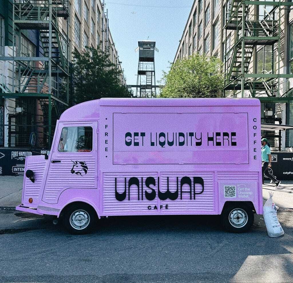 Durante a Permissionless, eles tomaram as ruas com cartazes criativos, trocadilhos sobre liquidez e tokens scam. Criaram uma van temática com cafés com referências à Uniswap. Tudo com o slogan “GET LIQUIDITY HERE”.