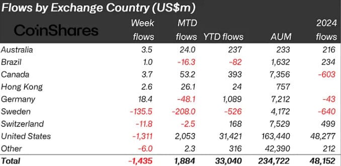 📉 Fluxo global negativo, mas Brasil compra — Fundos cripto têm maior sangria desde março (US$ 1,43 bi em saídas). Enquanto isso, Brasil registra entradas após quatro meses, com ETH liderando captação frente ao BTC.