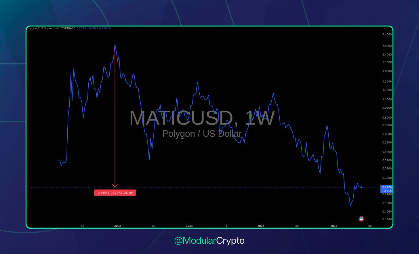 📉 POL cai 5% — token da Polygon reage à saída de fundador, ainda 92% abaixo da ATH.
