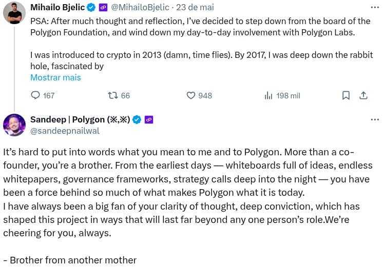“É difícil expressar em palavras o que você significa para mim e para a Polygon. Mais do que um cofundador, você é um irmão. Desde os primeiros dias — quadros brancos cheios de ideias, whitepapers intermináveis, estruturas de governança, reuniões estratégicas noite adentro — você tem sido uma força por trás de muito do que torna a Polygon o que ela é hoje. Sempre fui um grande admirador da sua clareza de pensamento e da sua profunda convicção, que moldaram este projeto de maneiras que durarão muito além do papel de qualquer pessoa. Estamos torcendo por você, sempre.
