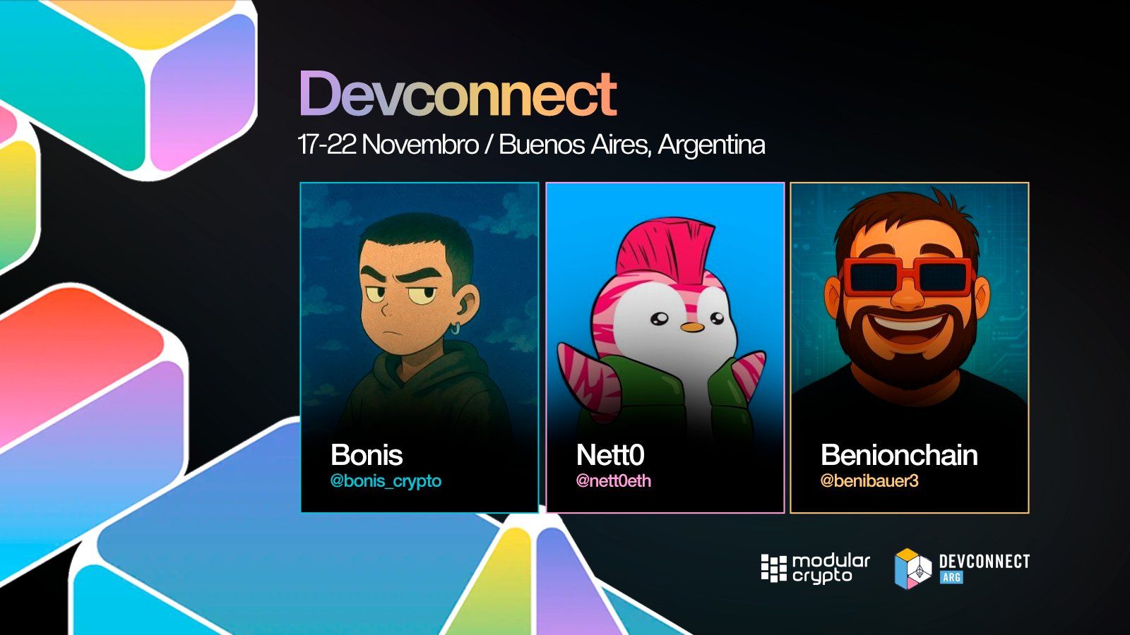 Nos prĂłximos dias, Bonis, Beni e Netto chegam ao Ethereum Devconnect pra representar o Brasil nas discussĂľes que estĂŁo moldando o futuro do ecossistema.