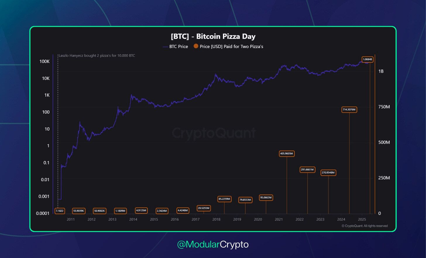 Não tinha momento melhor para o Bitcoin renovar sua máxima histórica senão quando o mercado comemora também o aniversário de 15 anos do icônico “Bitcoin Pizza Day”. Em 22 de maio de 2010, o programador Laszlo Hanyecz fez a primeira transação comercial conhecida em BTC, pagando 10 mil bitcoins por duas pizzas — o equivalente a US$ 40 na época. Hoje, esse mesmo valor ultrapassa US$ 1,1 bilhão, evidenciando a valorização exponencial do ativo desde seus primórdios como uma simples curiosidade entre cypherpunks.