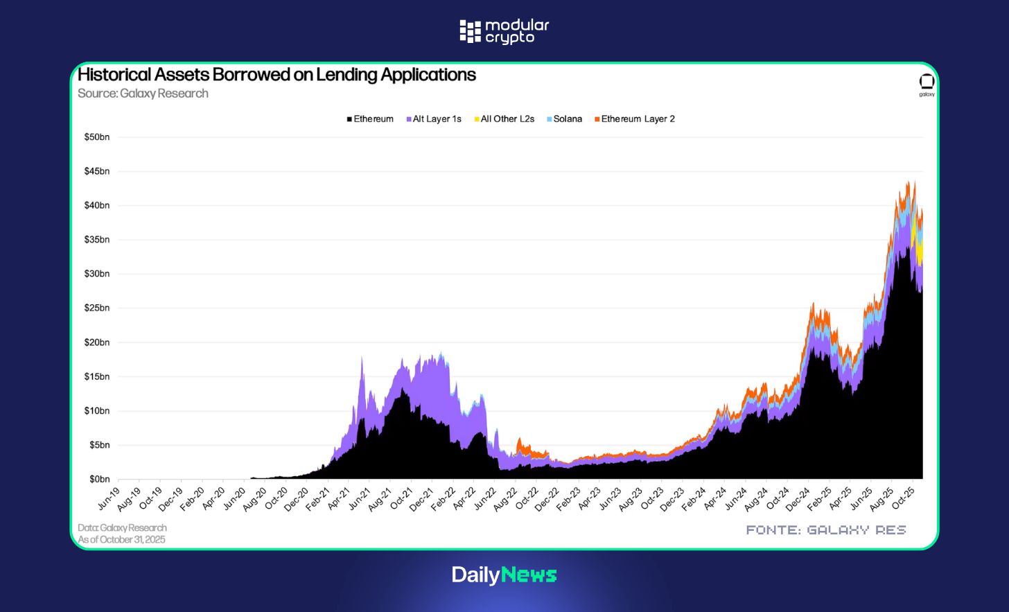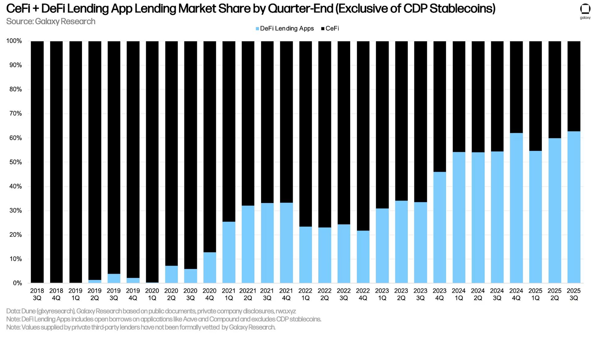 A Galaxy Research mostra que a alavancagem cripto voltou para a máxima histórica: o total de empréstimos colateralizados em cripto chegou a US$ 73,6 bi no fim do Q3, com os protocolos de DeFi respondendo por ~US$ 41 bi e dominando cerca de dois terços do mercado de crédito, bem acima de 2021. A diferença é que o “tijolo” da alavancagem mudou: hoje o grosso está em BTC, ETH e stablecoins (muitas vezes com yield), com exigência de colateralização bem maior e CeFi muito mais conservador do que no ciclo passado, quando crédito opaco e empréstimo sem garantia quebraram meia indústria. On-chain virou o centro do sistema: lending apps representam mais de 80% do crédito on-chain, enquanto CDPs (tipo DAI) perderam espaço.
