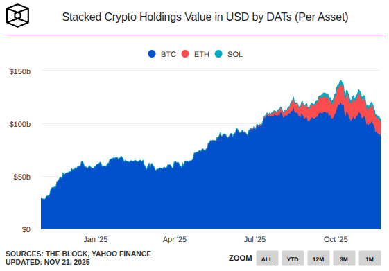 🏦 DATs sob pressão — tesourarias cripto saem de US$ 176 bi para ~US$ 99 bi, mNAVs afundam e começa a disputa entre quem continua comprando e quem é forçado a vender.