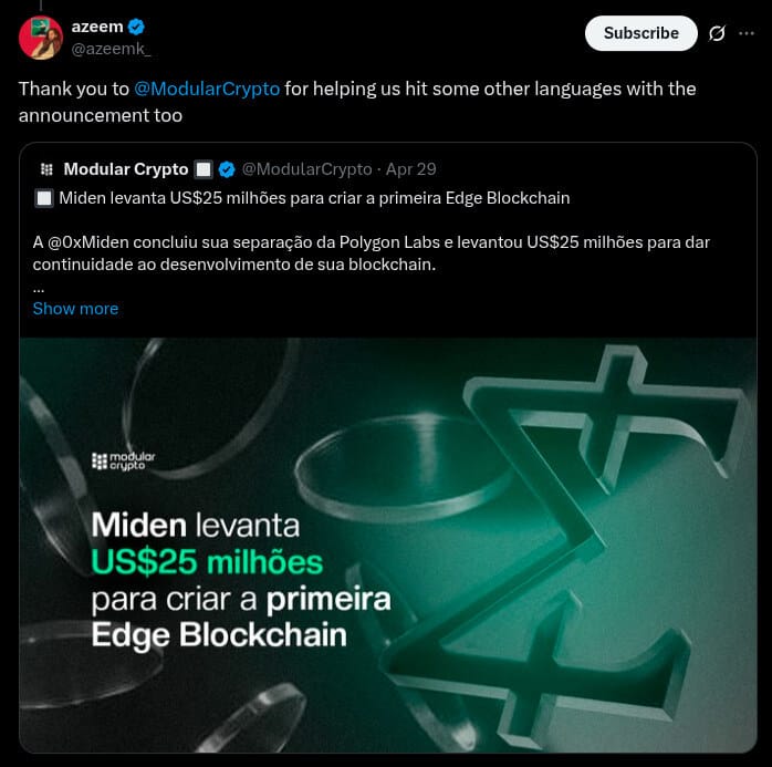 Sim, até o cofundador da Miden, rede que acaba de levantar US$25 milhões para lançar uma edge blockchain com foco em privacidade, citou a Modular ao lado de gigantes como Coindesk e Fortune.Nosso conteúdo ajudou a levar o anúncio para outros idiomas — e isso é só o começo.