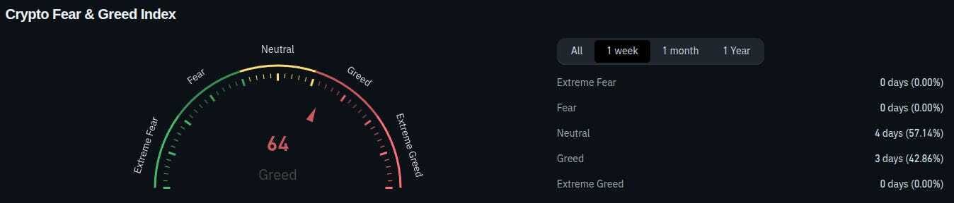 😱 Índice Medo & Ganância: 64 — zona de ganância, mas ainda longe da euforia.