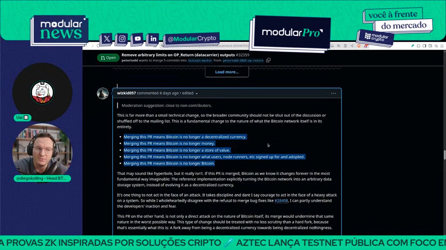 A proposta de remover o limite do OP_RETURN dividiu a comunidade. Para Jason Hughes, da Ocean, isso “mataria” o Bitcoin, mas outros veem a mudança como positiva. A discussão esquentou tanto que virou tema do Modular News, com Diego Kolling explicando por que o Hughes exagerou, e talvez nem seja isento na história. Assista agora mesmo: