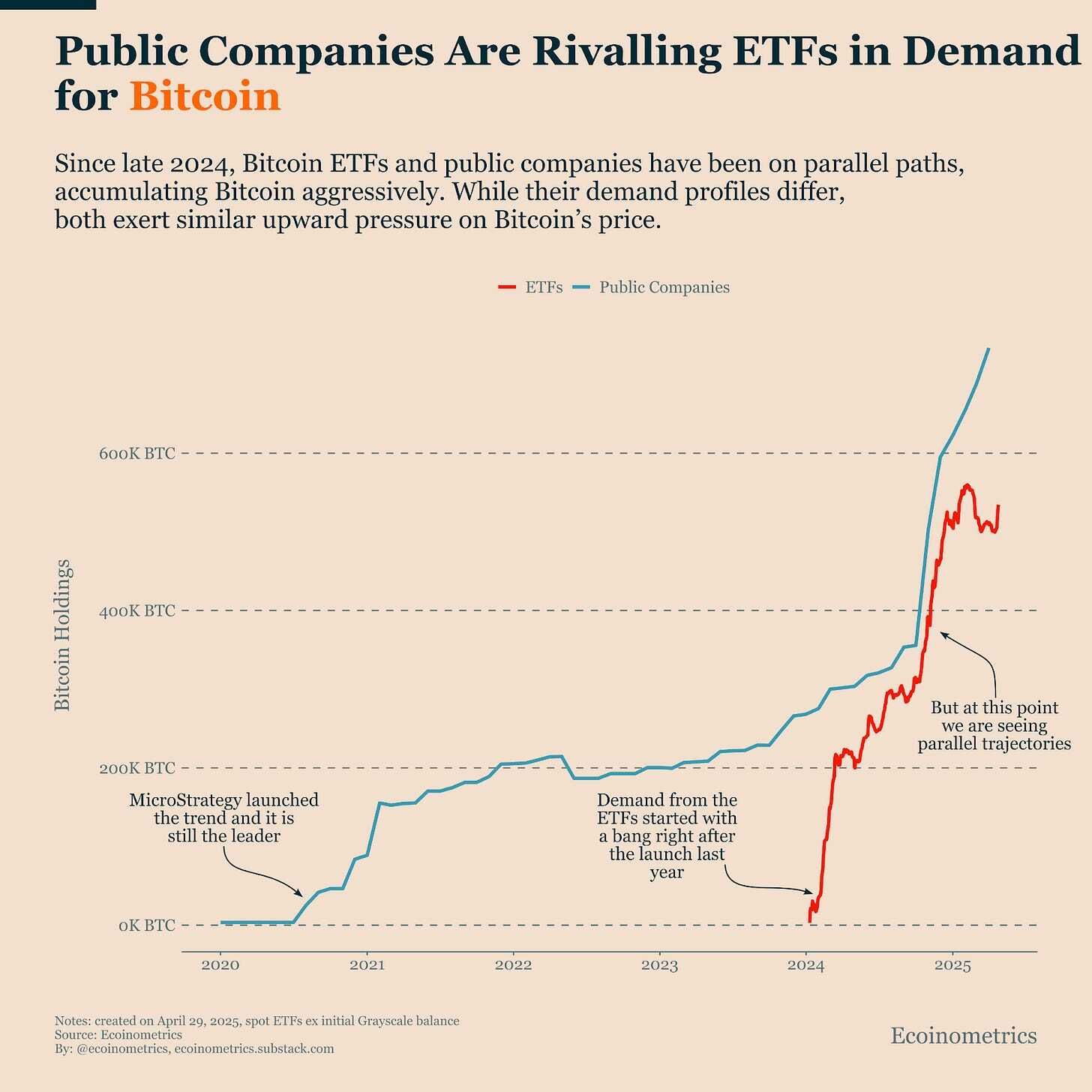 Além dos ETFs, empresas listadas passaram a acumular BTC de forma consistente desde o fim de 2024. O movimento, antes isolado na MicroStrategy, agora inclui mais players, criando um novo suporte de preço. Ainda concentrado — só 8 empresas têm mais de 10 mil BTC —, o ritmo é lento, mas firme, com decisões menos sensíveis ao mercado e mais estratégicas.