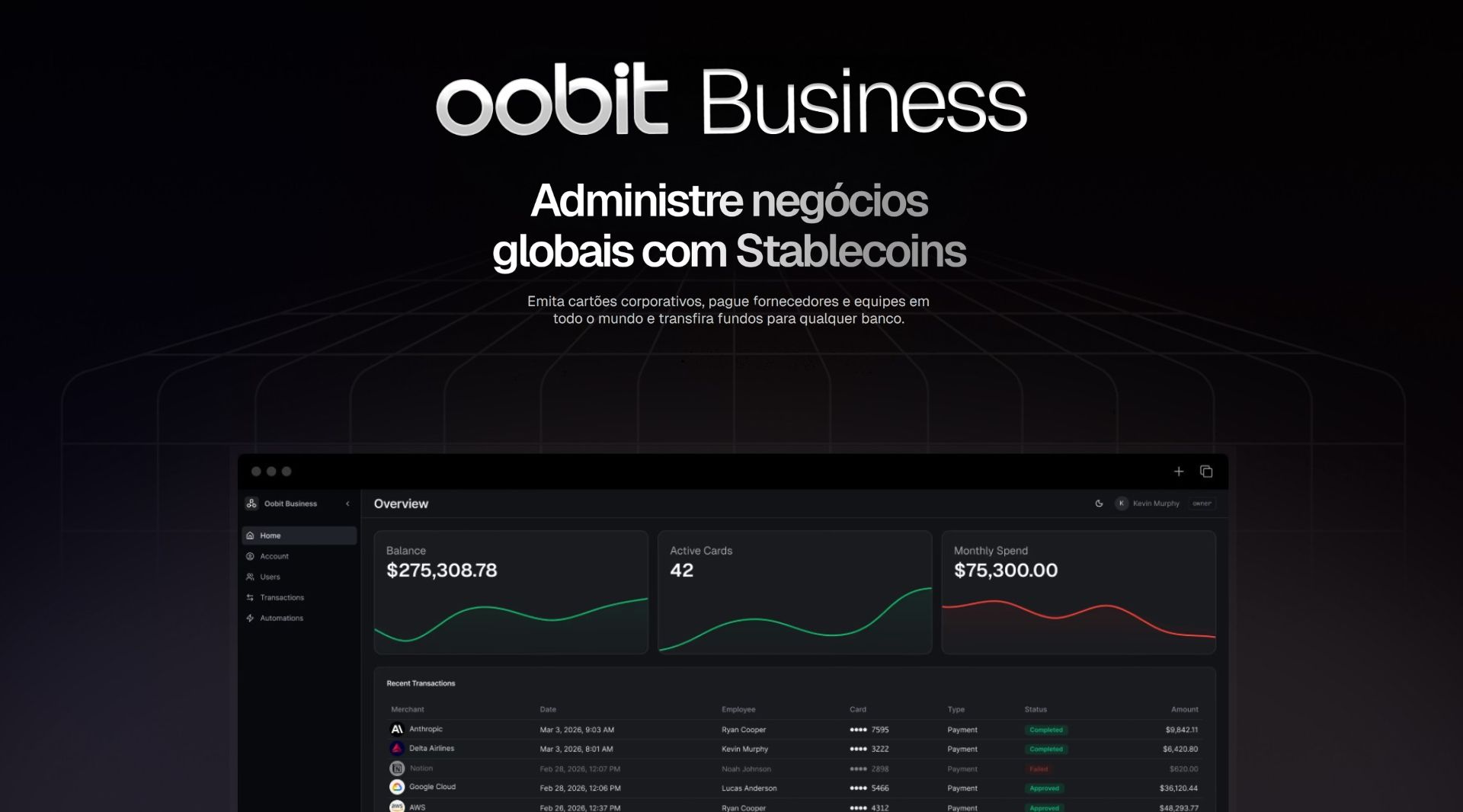 A Oobit lançou a Oobit Business, uma plataforma que permite a empresas de qualquer porte rodar suas operações financeiras diretamente de uma tesouraria em stablecoins. Com um único saldo, é possível emitir cartões corporativos ilimitados com limites personalizados, aceitos em mais de 200 países pela rede Visa, pagar fornecedores e times ao redor do mundo em segundos, e transferir stablecoins para contas bancárias globalmente via redes como SEPA, ACH e PIX. O cadastro é gratuito, com taxa de 1% nas transações com cartão e a partir de 1,2% nos envios bancários.
