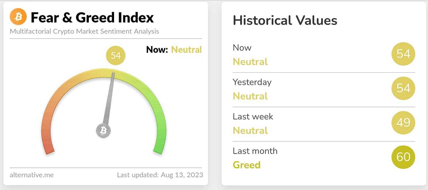 Índice Medo & Ganância (Fear & Greed Index) fecha a semana se mantendo em neutro, apesar do leve aumento.