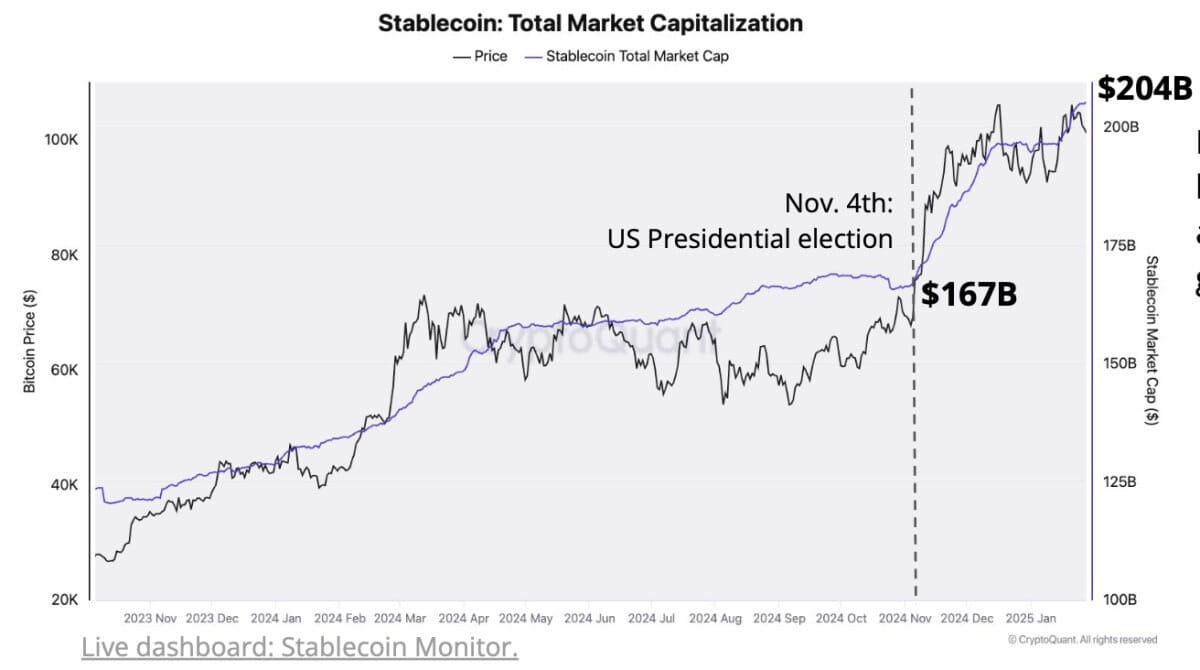 Desde a eleição de Trump, a capitalização das stablecoins subiu US$ 37 bilhões. O Tether (USDT) lidera, com aumento de 41% em depósitos nas exchanges. Será esse o combustível para o próximo rali?