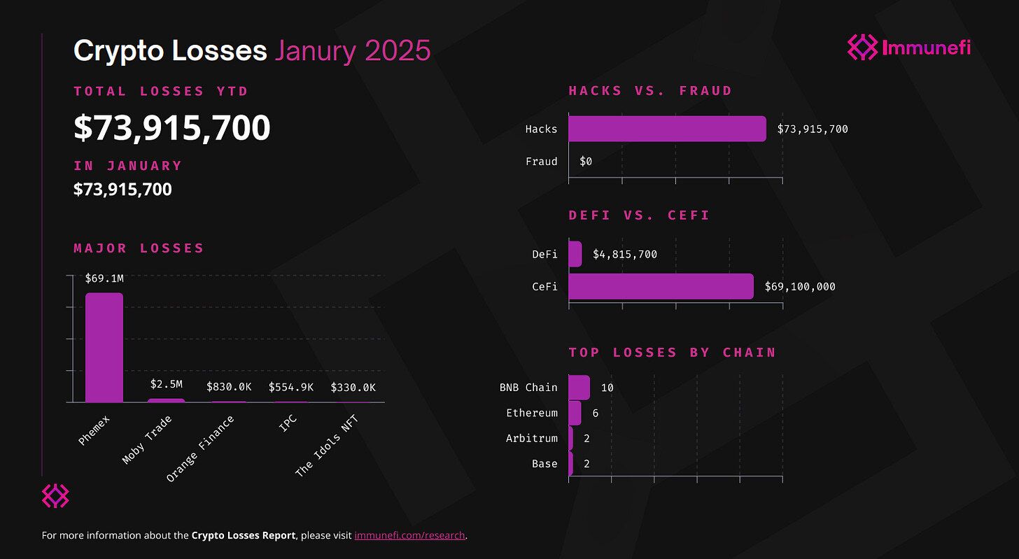 Os ataques no setor cripto caíram 44%, totalizando US$ 73 milhões roubados. O maior golpe foi contra a exchange Phemex, que perdeu US$ 69 milhões. A lição? CeFi segue sendo o elo mais fraco.