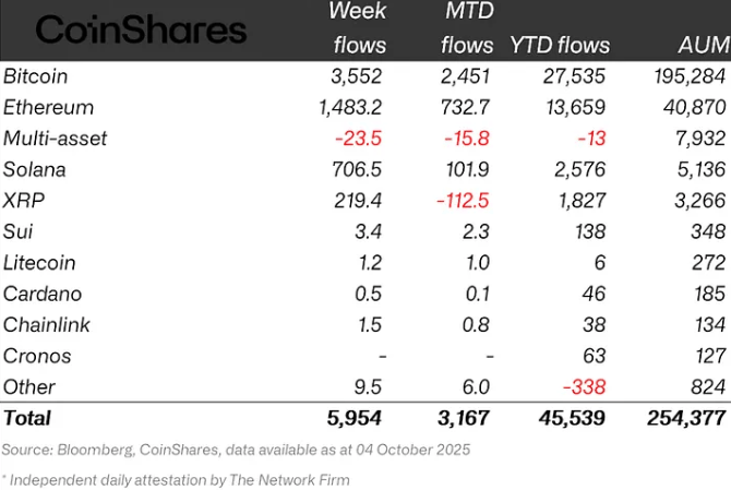 Os fundos de investimento em criptoativos registraram entradas líquidas de US$ 5,95 bilhões na última semana, marcando o maior volume semanal da história, segundo dados da CoinShares. O salto foi impulsionado por uma combinação de fatores macroeconômicos — fraqueza do mercado de trabalho nos EUA, temores de shutdown do governo e expectativas de novos cortes de juros pelo Fed — que levaram investidores a buscar proteção em ativos digitais. O movimento elevou o total sob gestão (AuM) global para um novo recorde de US$ 254 bilhões.