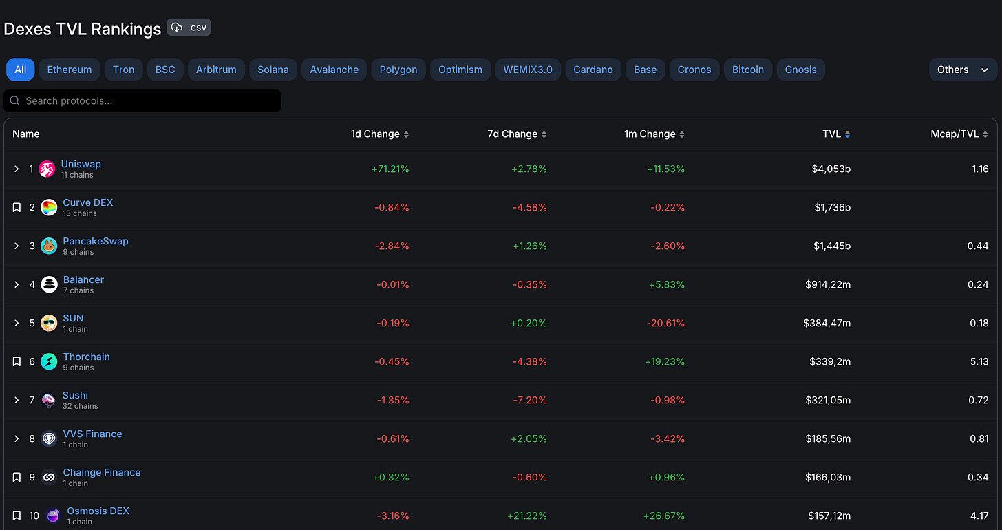 Atualmente, a Uniswap conta com um TVL (True Value Locked, a quantidade de liquidez que está trancada na plataforma) de mais de 4 bilhões de dólares. Ela é uma DEX nativa da rede Ethereum, mas atualmente já possui suporte à múltiplas blockchains, como Arbitrum, Polygon, Avalanche e até BSC. Isso a torna uma das principais escolhas dos investidores e entusiastas.