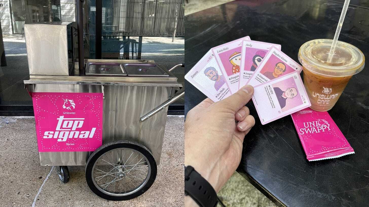 At Permissionless, they hit the streets with creative posters, puns about liquidity and scam tokens. They had a Uniswap-themed van serving coffee with on-brand references, all under the slogan “GET LIQUIDITY HERE.”
