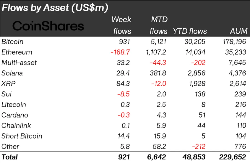 💵 Fluxos voltam com força — Produtos cripto receberam US$ 921 mi em entradas na semana, com EUA liderando e o Brasil aparecendo no verde. BTC dominou o apetite, enquanto ETH segue em saídas.