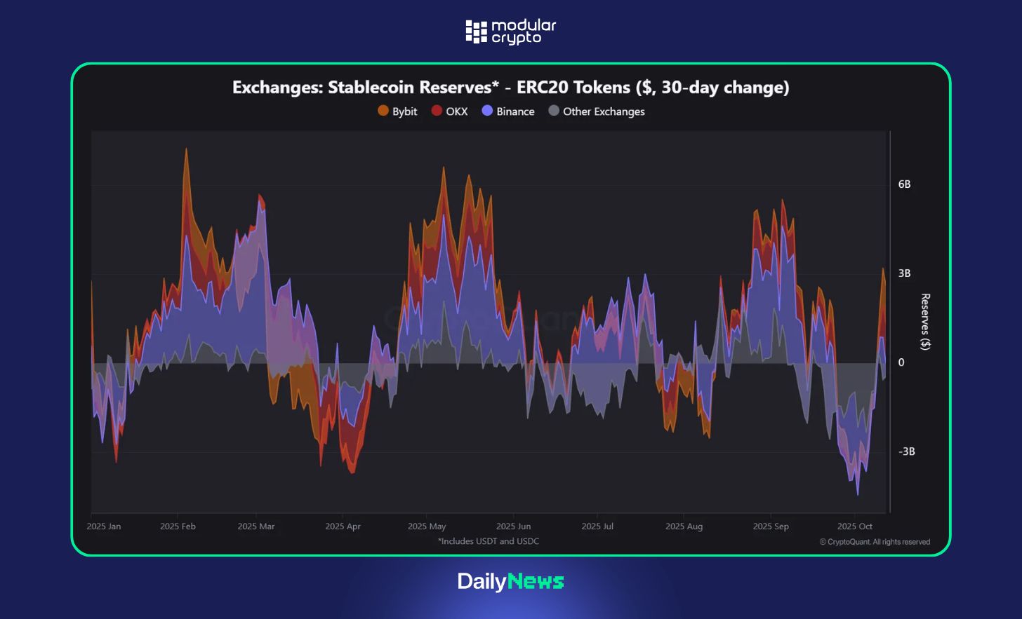 O gráfico da CryptoQuant mostra um forte influxo de stablecoins, com mais de US$ 3,2 bilhões entrando nas corretoras — o maior acúmulo de liquidez em mais de um mês.