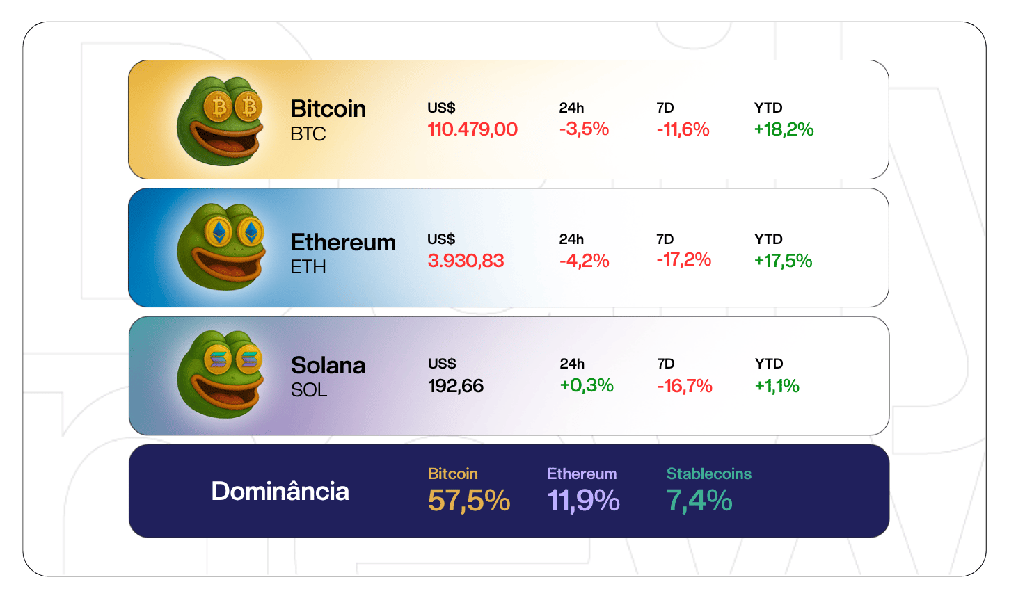 O Bitcoin liderou com US$ 2,67 bi, seguido por Ethereum (+US$ 338 mi), Solana (+US$ 93 mi) e XRP (+US$ 61 mi). A iShares (BlackRock) dominou os fluxos, com mais de US$ 3,2 bi só na semana. No recorte regional, os EUA concentraram 95% das entradas, enquanto o Brasil registrou leve saída de US$ 10 milhões, reflexo da correção de preços e da redução de liquidez local. Mesmo com a queda de 7% no total sob gestão (US$ 242 bi), o relatório destaca: “O fluxo de capital mostra confiança estrutural, não especulativa, no mercado cripto.”
