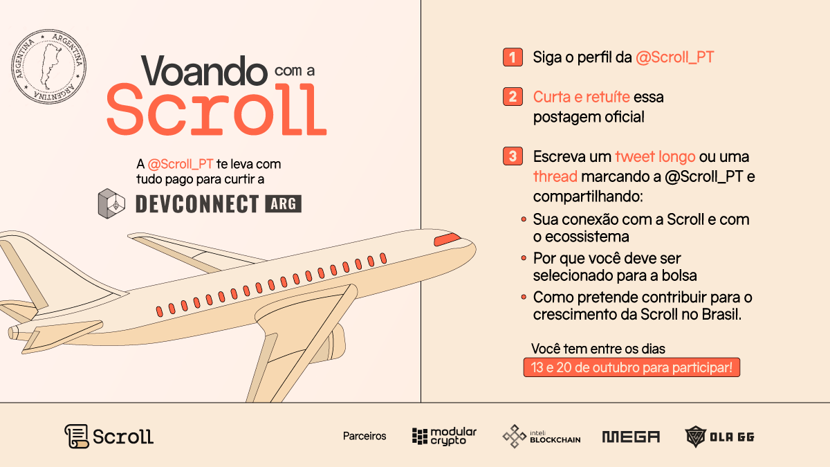 Essa iniciativa faz parte do programa de bolsas da Scroll, criado para fortalecer o ecossistema LATAM e aproximar talentos da região. Em parceria com Modular Crypto, Mega DAO, Inteli Blockchain e OLA Guild Games, será selecionada uma pessoa para viver essa experiência única: aprender, construir e fazer networking no maior evento da Ethereum Foundation na América do Sul.