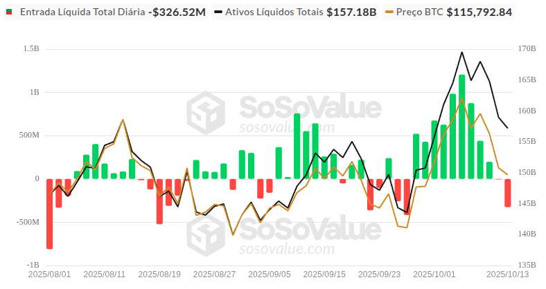 O primeiro pregão após o colapso histórico de sexta-feira começou com fluxos negativos nos ETFs e um clima de cautela global. Bitcoin e Ethereum caíram cerca de 3% e 4%, respectivamente, com o valor total do mercado cripto recuando para US$ 3,85 trilhões. Dados da SoSoValue mostram que os ETFs spot de Bitcoin registraram US$ 326 milhões em saídas líquidas, enquanto os de Ethereum perderam US$ 428 milhões — reflexo de um movimento de realização institucional após as liquidações de US$ 19 bilhões no fim de semana.