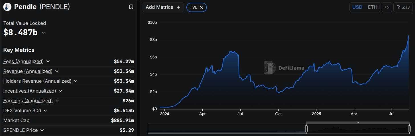 📈 Pendle quebra recorde de US$ 8,5 bi em TVL com o lançamento do Boros, plataforma para negociar funding rates via Yield Units. Nos dois primeiros dias, atraiu US$ 1,8 mi em depósitos e impulsionou o token PENDLE a +45% na semana.