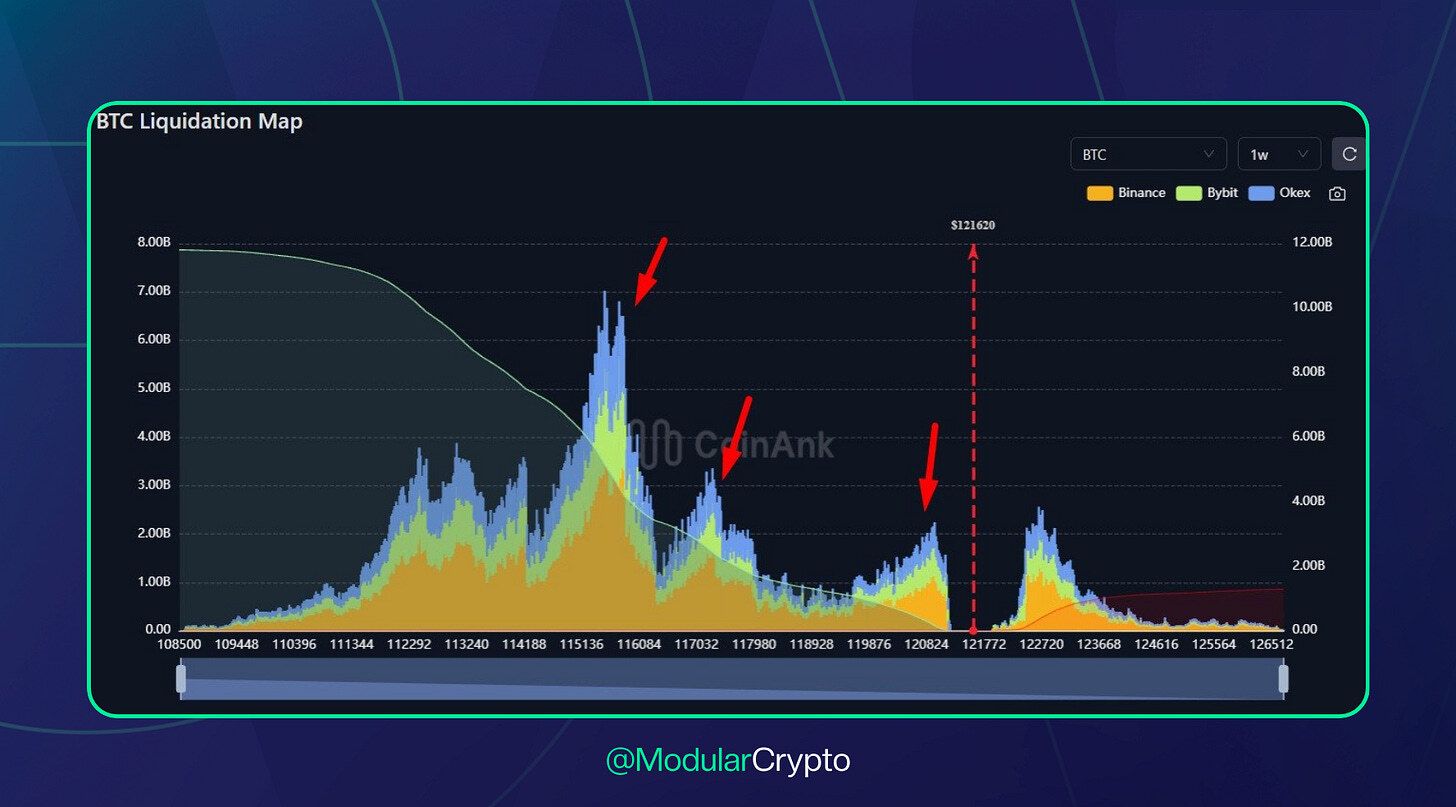 ⚠️ Liquidez de BTC desequilibra para baixo. Após a alta forte, há mais de US$ 10 bi de contratos comprados até ~US$ 112K e um gap aberto na CME logo abaixo de US$ 118K — correção curta pode aliviar risco nos derivativos.