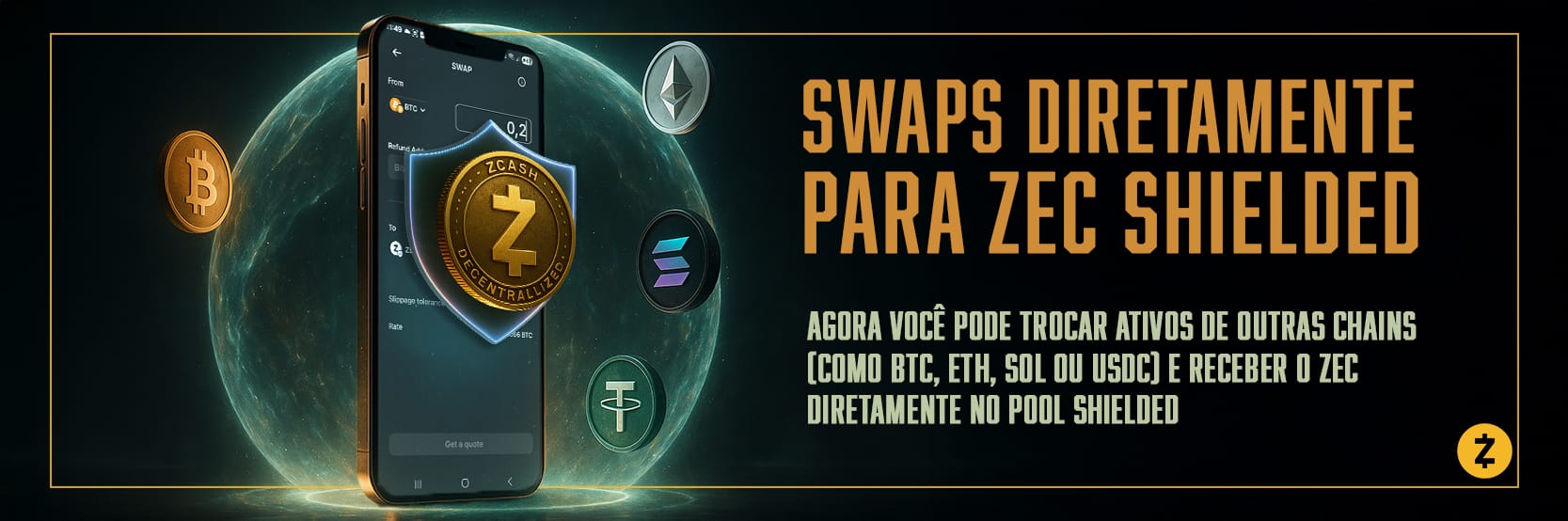 • Troque BTC, ETH, SOL, USDC e outros ativos direto para a shielded pool do ZEC