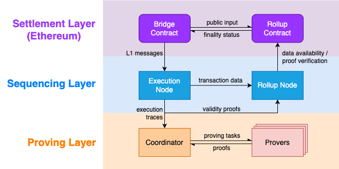 Camada de Liquidação (Settlement Layer):A Scroll utiliza a Ethereum como sua camada de liquidação. Nesse contexto, liquidação se refere à etapa em que as transações são registradas de forma final e imutável, ancoradas na segurança de uma blockchain robusta.É nessa camada que estão implementados os contratos de ponte (bridge) e de rollup da Scroll. Dessa forma, a rede ancora sua execução em uma base segura e descentralizada, herdando diretamente a segurança, a imutabilidade e a confiança da Ethereum.Essa camada cumpre funções essenciais: garantir a disponibilidade de dados, manter a ordenação das transações e verificar as provas de validade geradas na camada 2 (zk-proofs). Também viabiliza a comunicação entre Scroll e Ethereum, permitindo que usuários e dApps enviem mensagens e ativos entre as duas redes.