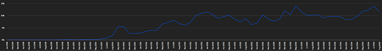 Em julho, que o último pico da direita ali, a gente teve o terceiro maior volume do ano e o maior percentual da Proporção DEX para CEX desde maio de 2023. Em julho, as DEX representaram praticamente 14% de todo o volume negociado em