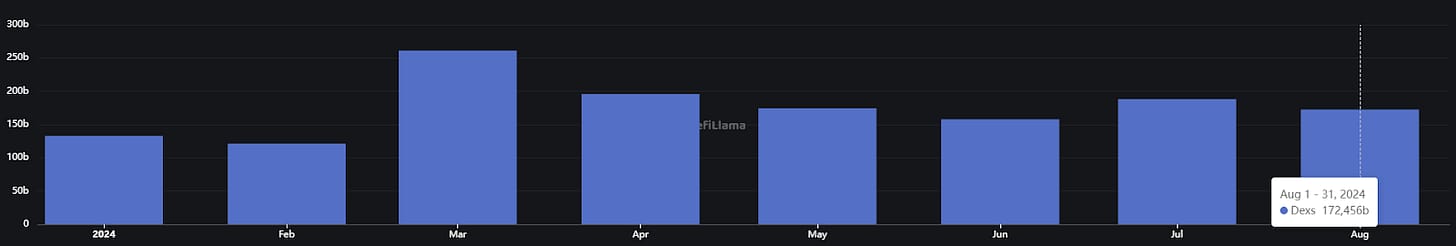 E aqui vai algo legal: na curta história das finanças descentralizadas (DeFi), só 11 meses ultrapassaram US$ 150 bilhões em volume negociado, e seis deles são justamente os meses que compõem esse tremzinho de 2024.