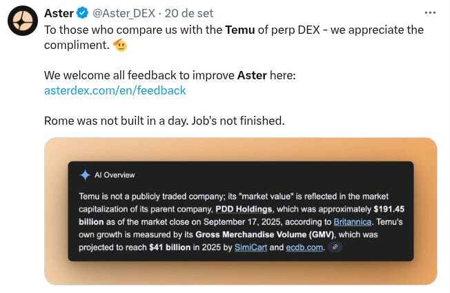 A Hyperliquid, por sua vez, tenta responder com a criação da USDH, sua stablecoin nativa, que será emitida pela Native Markets com reservas em T-bills e parte do rendimento destinada a buybacks de HYPE. O projeto reforça a ambição de consolidar o ecossistema em torno da exchange, mas o mercado segue dividido: de um lado, a Hyperliquid ainda domina em volume e liquidez; de outro, a Aster, a Temu das perp DEX, surge como o desafiante mais barulhento do momento, levantando a dúvida central da guerra — quem vai segurar a coroa dos perpétuos no próximo ciclo?