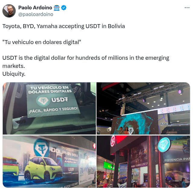 “Toyota, BYD e Yamaha aceitam USDT na Bolívia