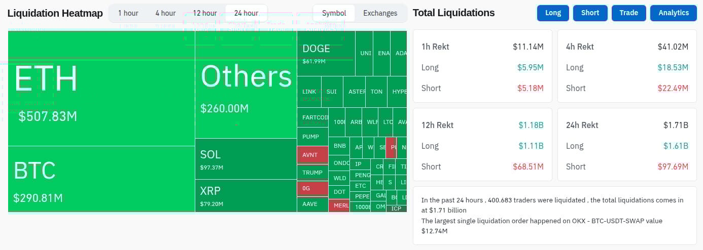 📉 Alavancagem no ralo — Quase US$ 1,7 bi em liquidações (95% longs), 400k traders atingidos; BTC −2% segura a dominância enquanto ETH, SOL e DOGE apanham mais forte.