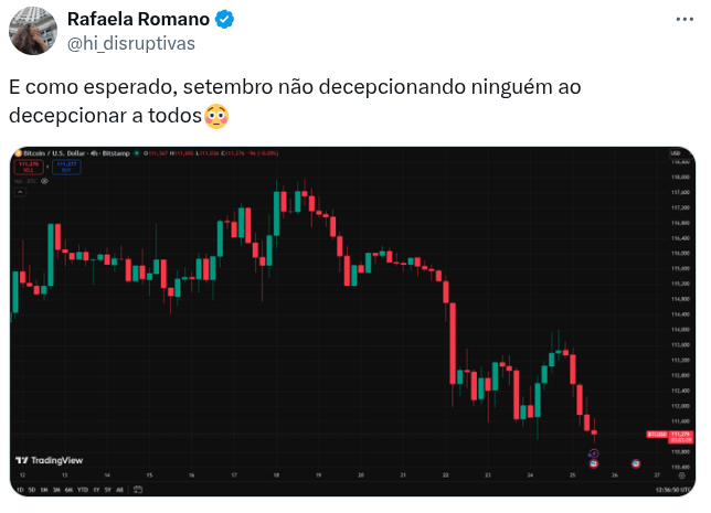 📊 BTC comprimido — Bandas semanais de Bollinger na menor faixa da história: volatilidade grande à vista, direção a definir.
