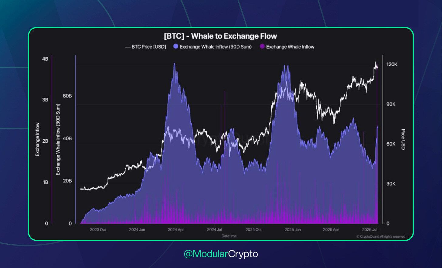 O gráfico mostra um salto nas entradas de Bitcoin de baleias (grandes holders) nas corretoras — um comportamento que historicamente antecipa zonas de topo. As últimas vezes que isso aconteceu, o movimento coincidiu com momentos de forte realização.