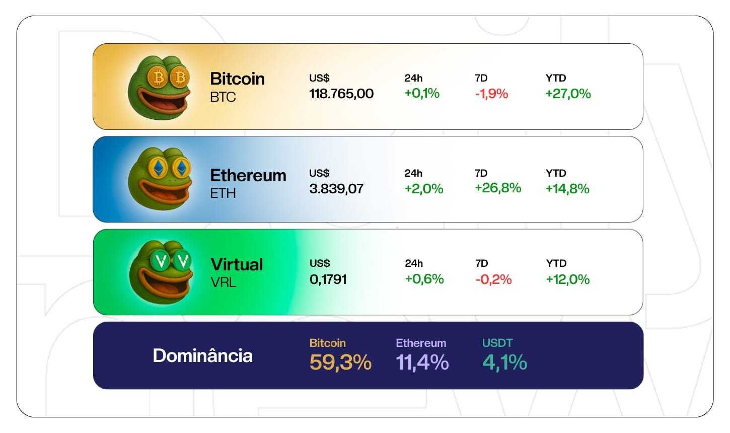 Com o reconhecimento legal dos stablecoins como “dinheiro digital”, a rede Ethereum — principal trilho para esse ecossistema — viu o preço do ETH saltar 25% na semana e 45% nas últimas duas. ETFs de Ethereum bateram recordes de entrada e empresas estão acumulando ETH como tesouro, repetindo a estratégia vista com o BTC. Bancos e fintechs também estariam comprando ETH para operar diretamente na rede. Para os analistas, a narrativa agora é clara: o Ethereum não está apenas acompanhando o mercado — está liderando uma nova fase.