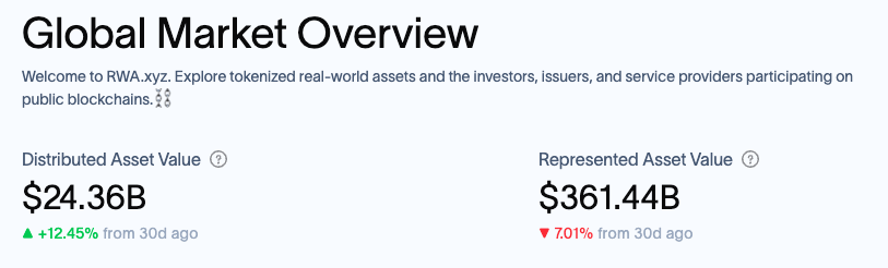 O RWA.xyz reporta $24,3 bilhões como “distributed RWAs”, ativos realmente disponíveis onchain. Ao mesmo tempo, a plataforma mostra $361 bilhões como “represented RWAs”, incluindo ativos que usam blockchain só como registro.