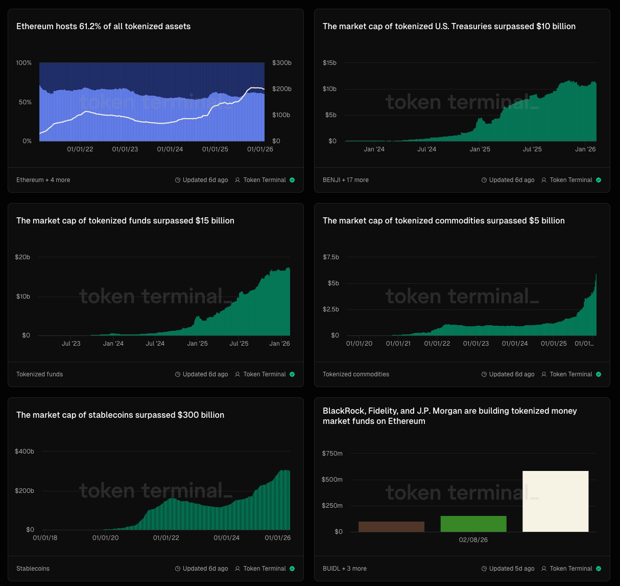 Segundo Token Terminal, o setor conta hoje com mais de $15 bilhões em fundos, mais de $10 bilhões em títulos do tesouro Americano, mais de $5 bilhões em commodities, e cerca de $500 milhões em ações.