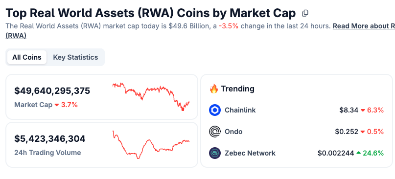 E o CoinGecko reporta a categoria de cripto ativos relacionados a RWA com $49,6 bilhões de market cap.